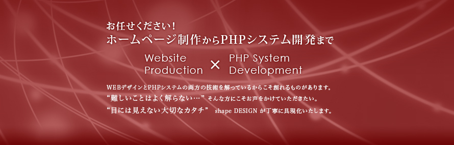 シェイプデザインにはホームページ制作(WEBサイト制作)とPHPシステム開発のふたつの技術とノウハウがあり、さらにSOHO(個人事業)ならではの価格を抑えた制作・開発を行うことができます。